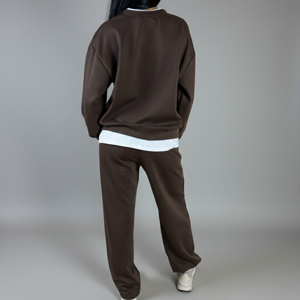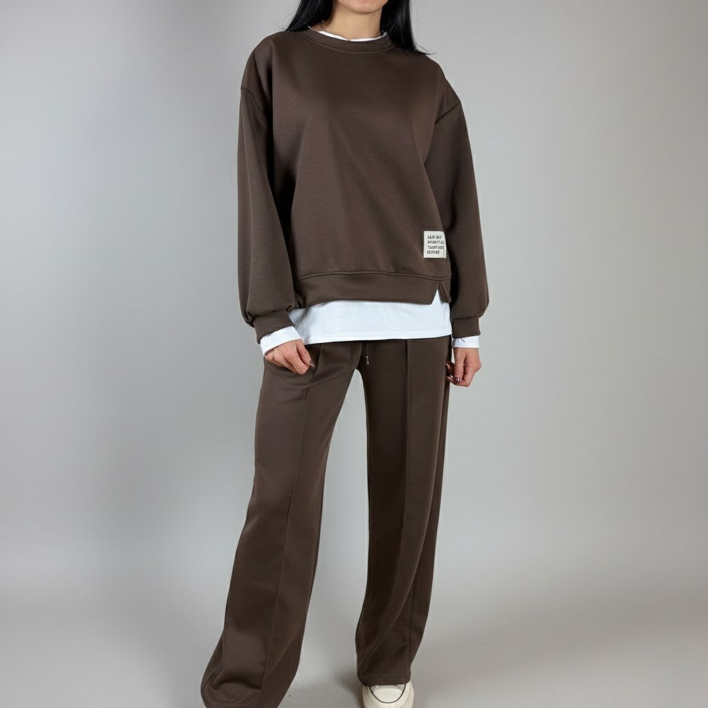 Стилен кафяв комплект, съчетава комфорт и елегантност в едно. С този комплект ще изглеждате модерно и ще се чувствате удобно през целия ден. Суитшъртът с удобна кройка и панталоните с прав крачол предлагат максимален комфорт, подходящи за ежедневни излизания или по-непринудени поводи. Моделът е с височина 168 см.