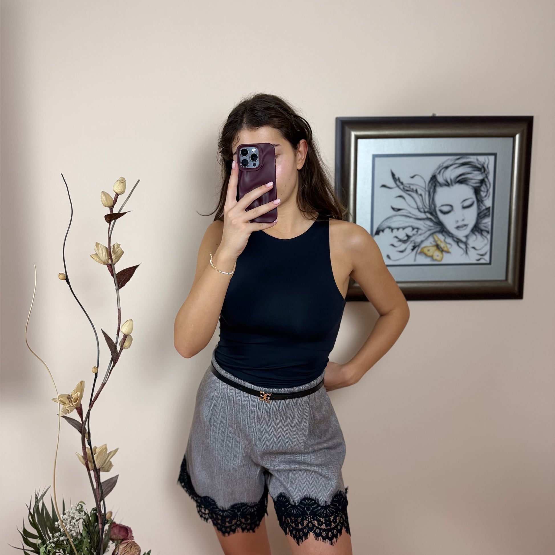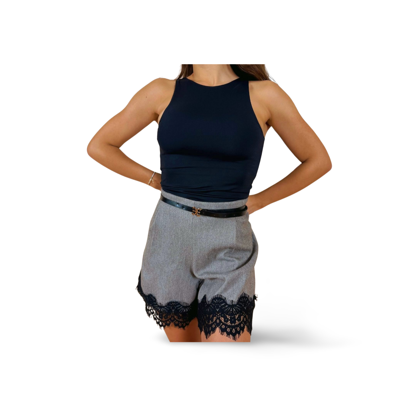 Елегантен къс панталон с подчертаваща дънтела и колан.