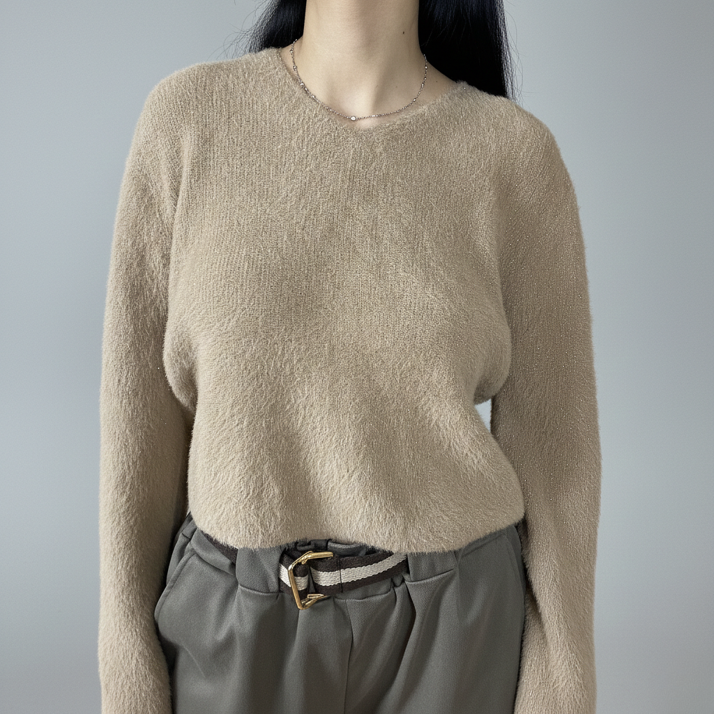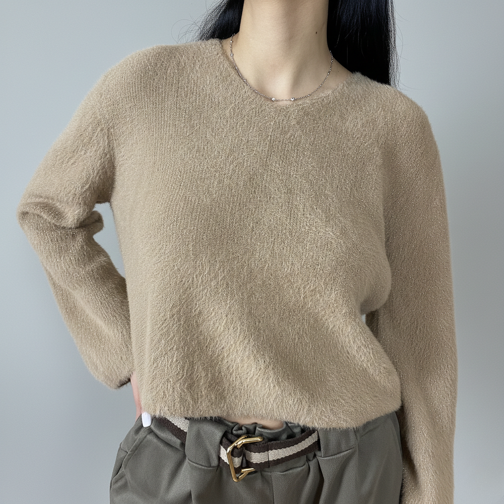 Този нежен пуловер внася топлина и мекота в гардероба Ви, превръщайки се в перфектния избор за хладните дни. Характерната му черта е фината, пухкава материя с дискретни блестящи нишки, които улавят светлината и придават изтънчен чар на модела. Свободната кройка и класическото обло деколте осигуряват несравним комфорт, като едновременно с това поддържат модерна и непринудена визия.