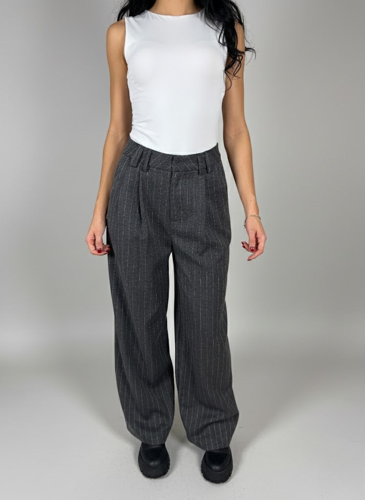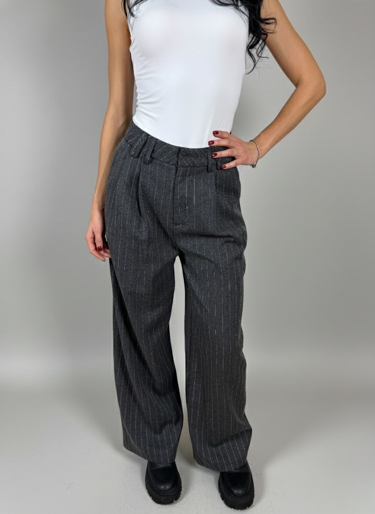 Раирани панталони с камъчета предлагат елегантен и модерен външен вид, идеален за офис облекло или официални поводи, както и за ежедневно носене. Съчетават се лесно с блузи или ризи за класическа визия, подчертаваща вашия стил и комфорт. Моделът е с височина 168 см.