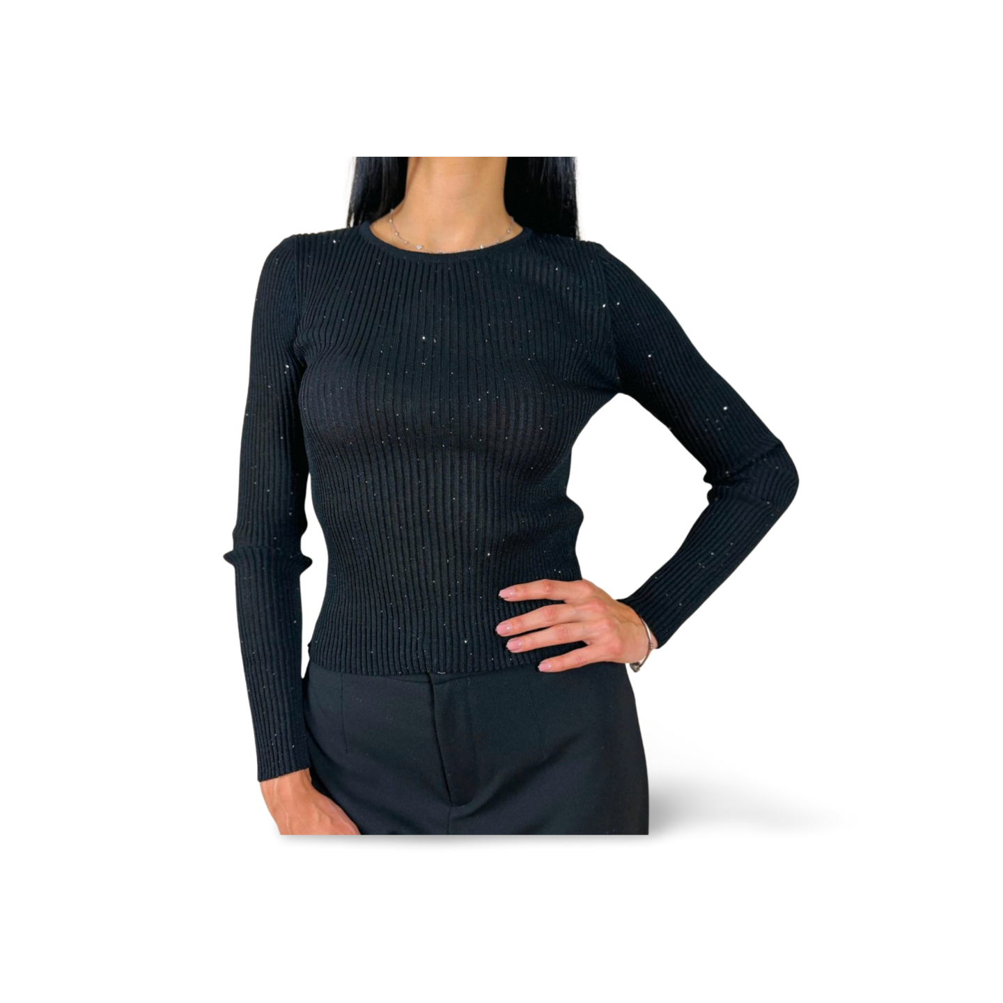 Тази черна блуза с метални пайети по целия си обем е чудесен избор за по-официални, но и ежедневни поводи. Със своята тясна и прилягаща кройка, тя подчертава фигурата и е идеална за вечерни излизания, партита или дори за офис комбинации. Създайте перфектната визия с тази блуза, съчетана с пола или тесни дънки.
